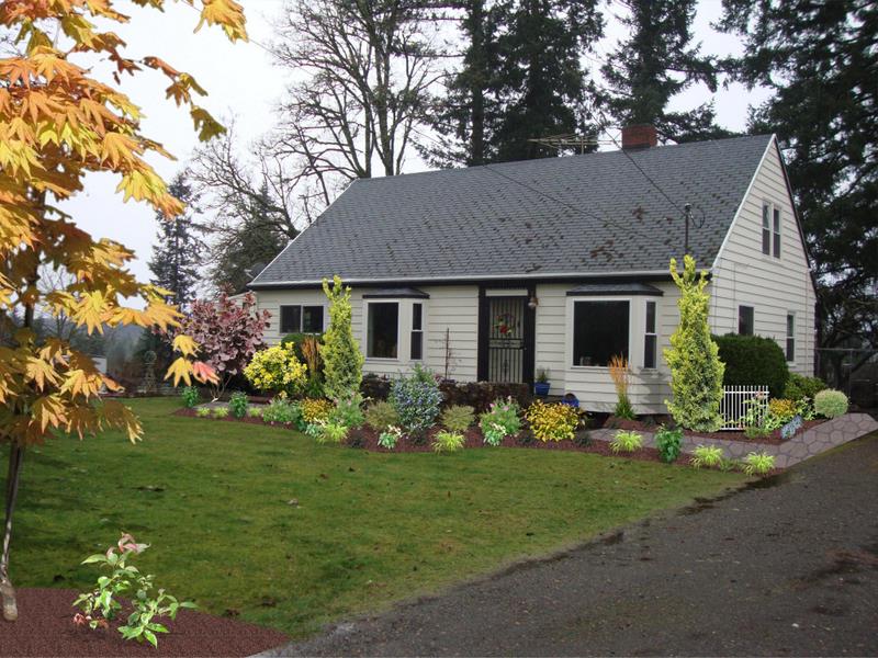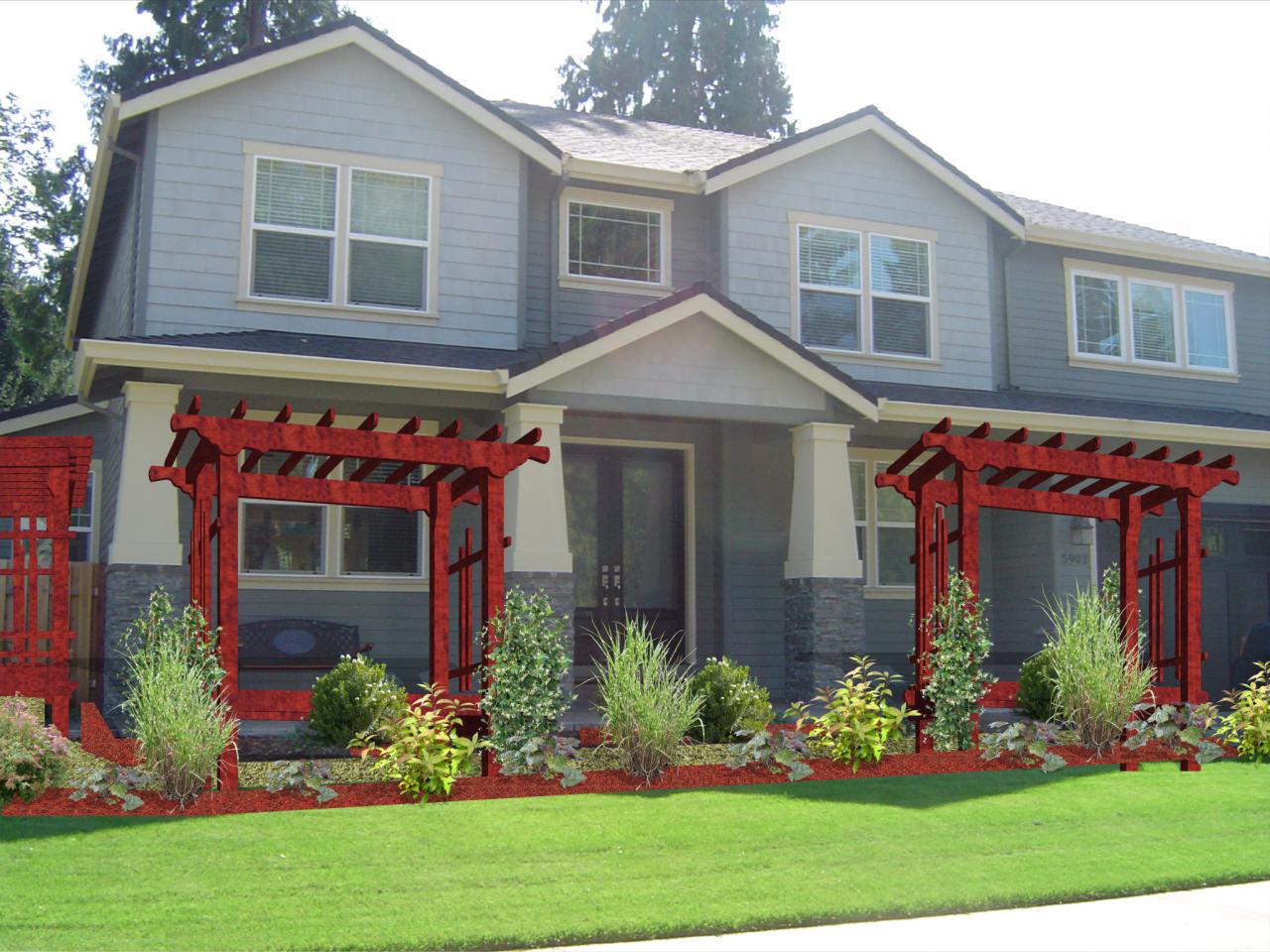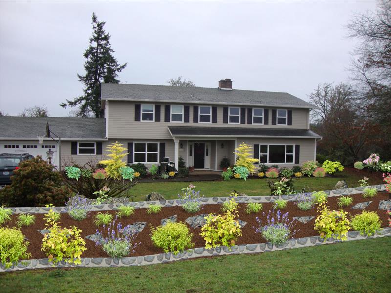 These images of before and after are in 3D and can easily be changed to create the style the client is looking for. They are meant to show the client what the plants and landscape would look like when established.