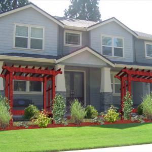 The home owner wanted the front of the house to stand out, but not cover the entrance. An additional corridor was created to make the landscape stand out against the large home. Drought tolerant plants and vines were added to create depth.